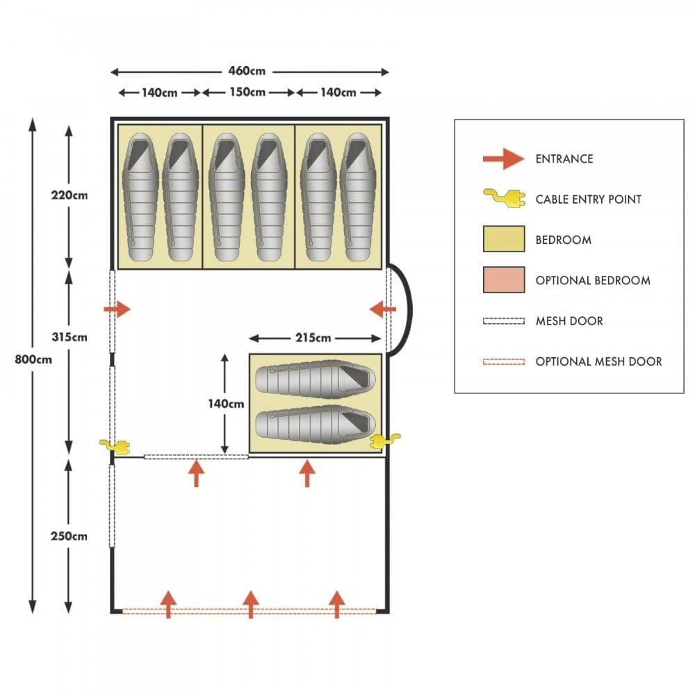 - Spacious and Comfortable: Accommodating up to 8 people, the AirTek 8 Pro features a large and generous bedroom at the rear of the tent. Designed in a 2+2+2 configuration with zipped dividers, you have the flexibility to create separate rooms or combine them into one spacious living area. The Super Darkened bedrooms/outer-flysheet and improved ‘Sleep Easy’ feature ensure a peaceful and restful sleep. Plus, the new huge rear zipped vent provides excellent airflow and ventilation, which can be fully sealed in colder weather.