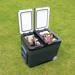 Two durable steel burners evenly heat the split enamelled stamped steel cooking grids and a folding warming rack provides a higher level to slow cook on. Two side shelves for food preparation.