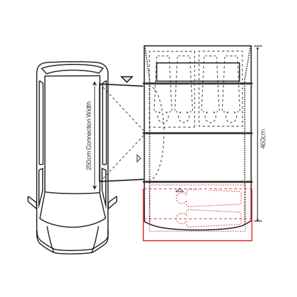 This lightweight Driveaway awning is designed in the popular side-by-side style, meaning the front of the awning faces the same direction as the front of your vehicle. Pitched using fibreglass poles, it’s small pack-size yet large internal space makes it a fantastic choice for families and couples alike. Available in 2 ergonomic cowl sizes to fit rail heights of up to 255cm, the Cayman Curl XLE has the option to attach a Zip-On Porch Door which will fully enclose the front porch. This porch door creates a huge amount of additional living space, and also allows for the addition of a ‘Cabin Inner’ bedroom which when used alongside 2x standard 2-berth inners, effectively creates sleeping capacity for up to 6 people.The large open canopy is perfect for sunshade, to use as a cooking area, or for weather protection while the main front door is open. There is also a large door in the rear of the cowl to allow access to the vehicle without the need to come through the awning itself. A rear ventilation panel coupled with under-window vents and mesh in the cowl door help to maintain airflow inside the awning while minimising condensation. Fixing Height 210cm-255cm (Mid) • 120HDE Hex high density all weather lightweight fabric