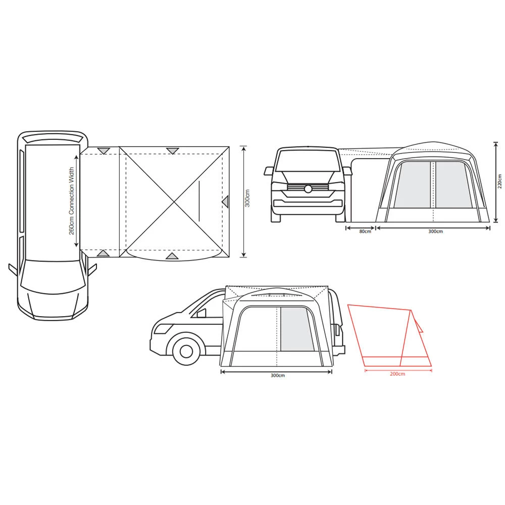 This lightweight pole and sleeve drive-away awning remains the most popular, upper entry-level small family weekender on the market. With just two fibreglass poles used to create the main body of the awning it is quick and easy to pitch, and structurally very stable. The unique design means this is one of the most versatile driveaways on the market, offering access from all sides of the awning through the large roll back doors. Has the option to zip a Cayman Bedroom Annex to the back of the awning, meaning your main living space is not affected if you are looking to add sleeping space. Available in Three ergonomic cowl heights to suit the vast majority of campervans & motorhomes, the Cayman F/G offers unrivalled value for money. Including a ‘fold-flat’ sewn-in groundsheet, and lots of ventilation with plenty of mesh fly screen panels, this is the awning of choice for smaller touring families, couples or independent adventurers, who crave more usable space alongside their van, to meet a budget. Fixing Height 180cm – 220cm (Low). • 120HDE high density all-weather lightweight fabric
